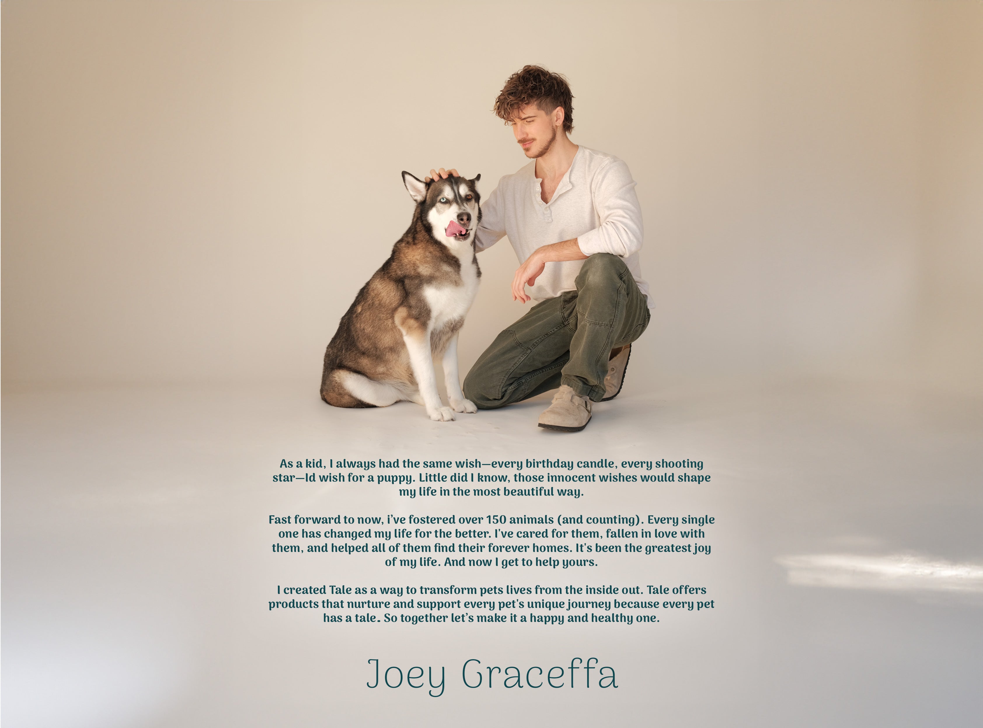 Tale is a community driven pet wellness brand founded by the influential Joey Graceffa, who is dedicated to rescuing and rehabilitating animals. The brand is built on translating Joey's expertise and passion into products for pets (& a few for their humans, too) that embody holistic care. Tale supports a full range of pet wellness supplements to accessories+ more.